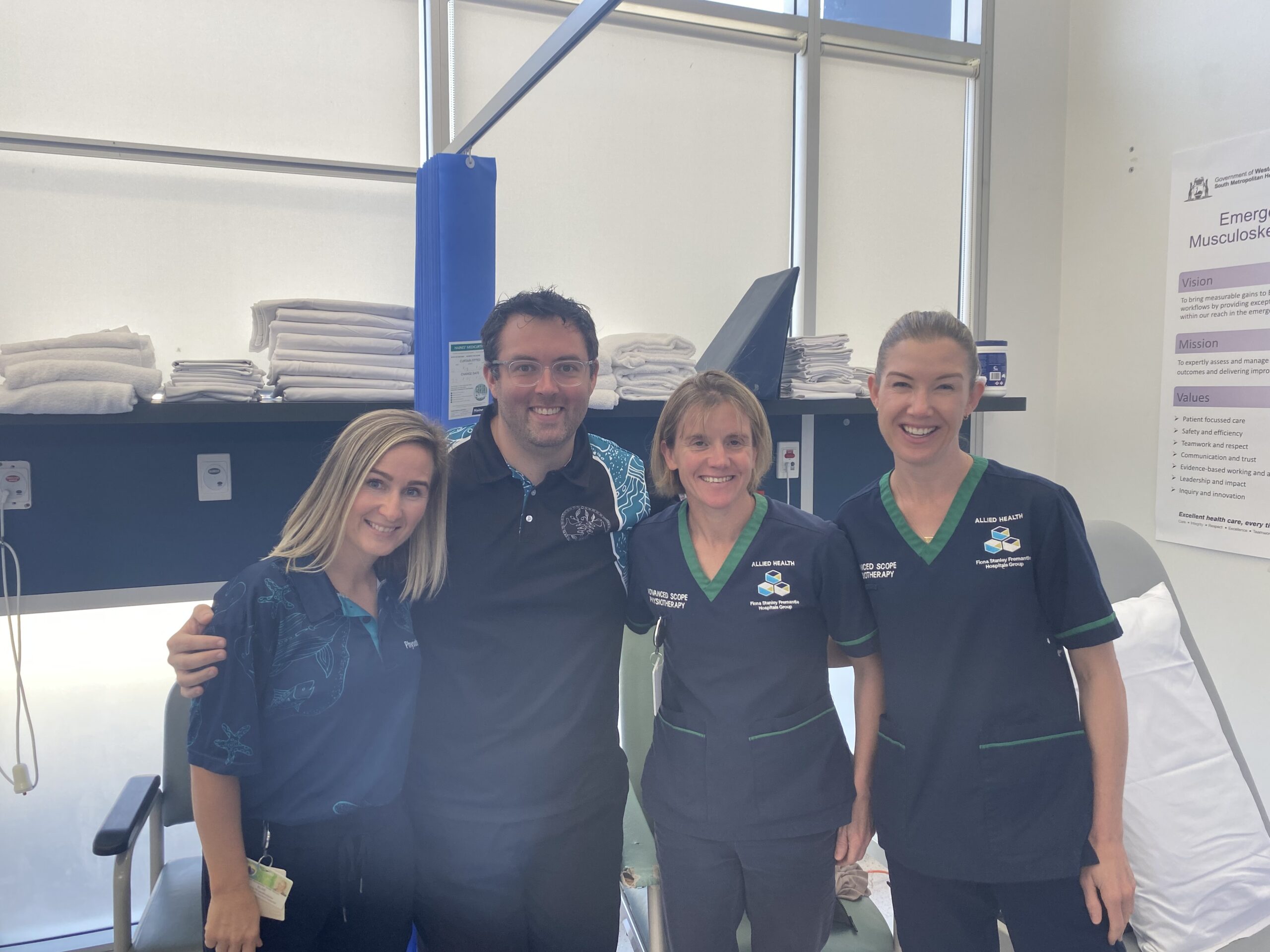 Today, if you or a family member visits Rockingham ED with these sorts of concerns, you might meet someone from the Emergency Department Musculoskeletal Diversion Pathway (EDMDP) team. This team of highly skilled Advanced Scope and Senior Physiotherapists work collaboratively to identify, assess, and treat patients directly from the ED. The EDMDP team is not only reducing wait times and lengths of stay, but with patient satisfaction scores of 99% it’s also clear that ‘patients love it’. The team is saving money, reducing waiting times and freeing up thousands of hours of ED capacity.
